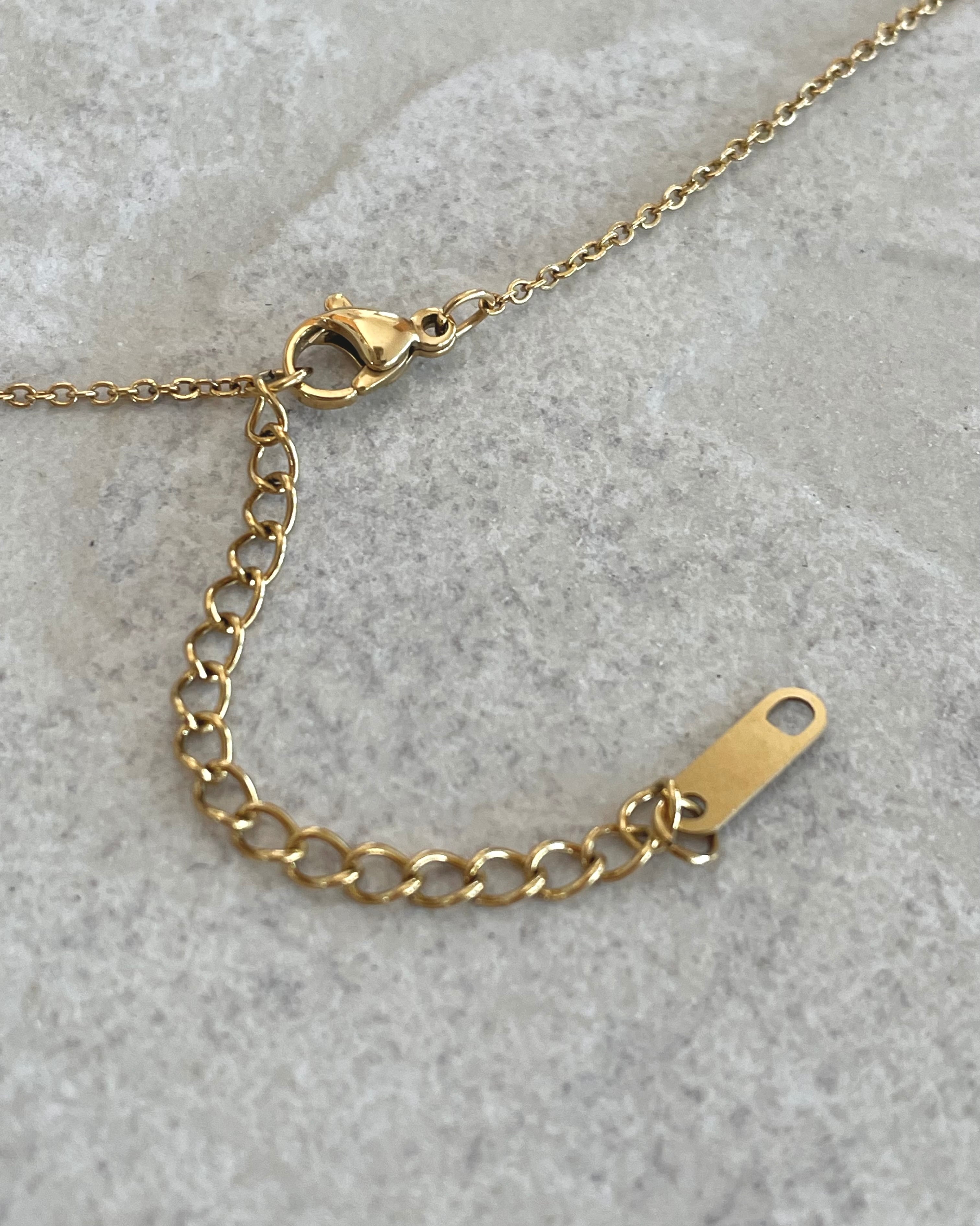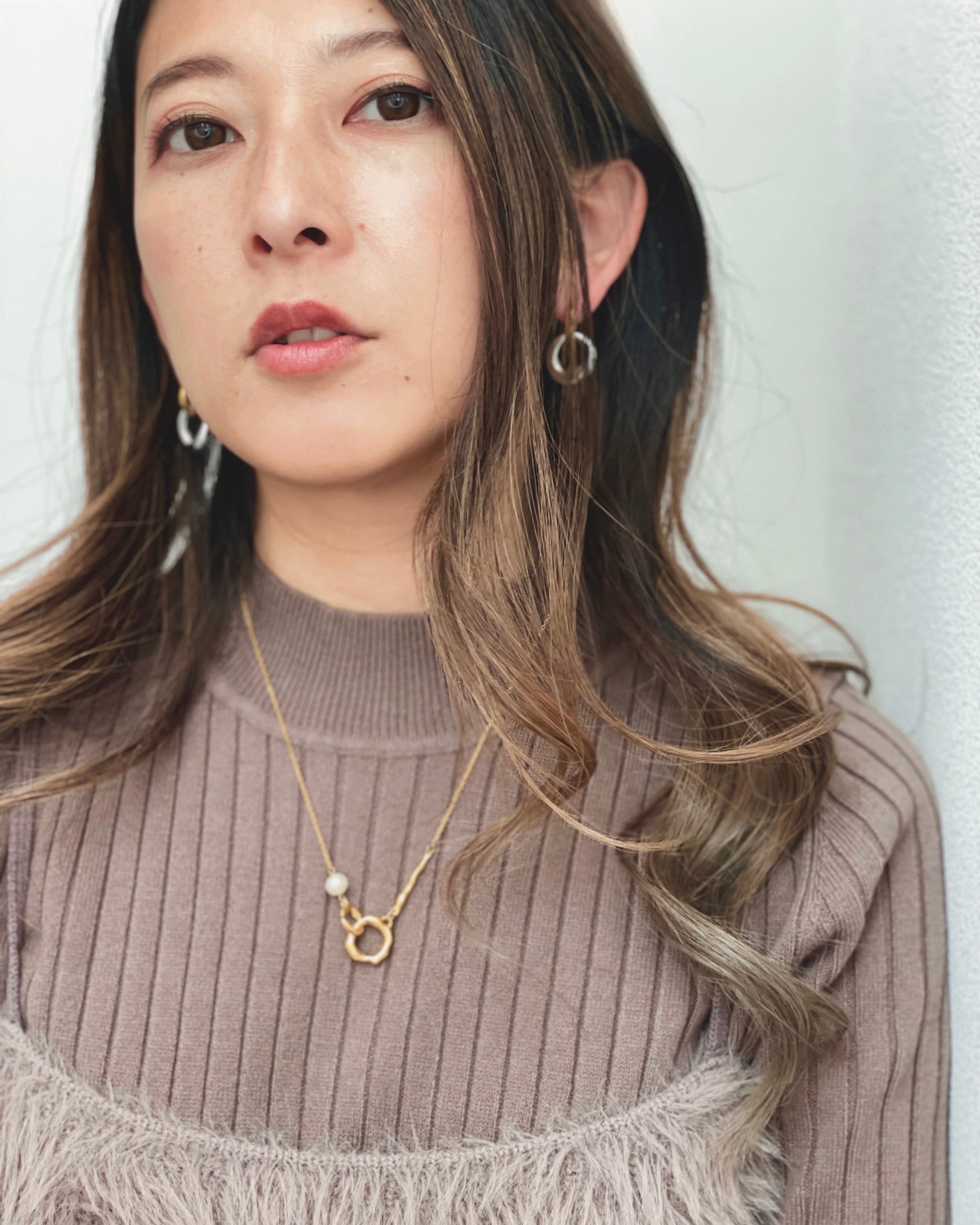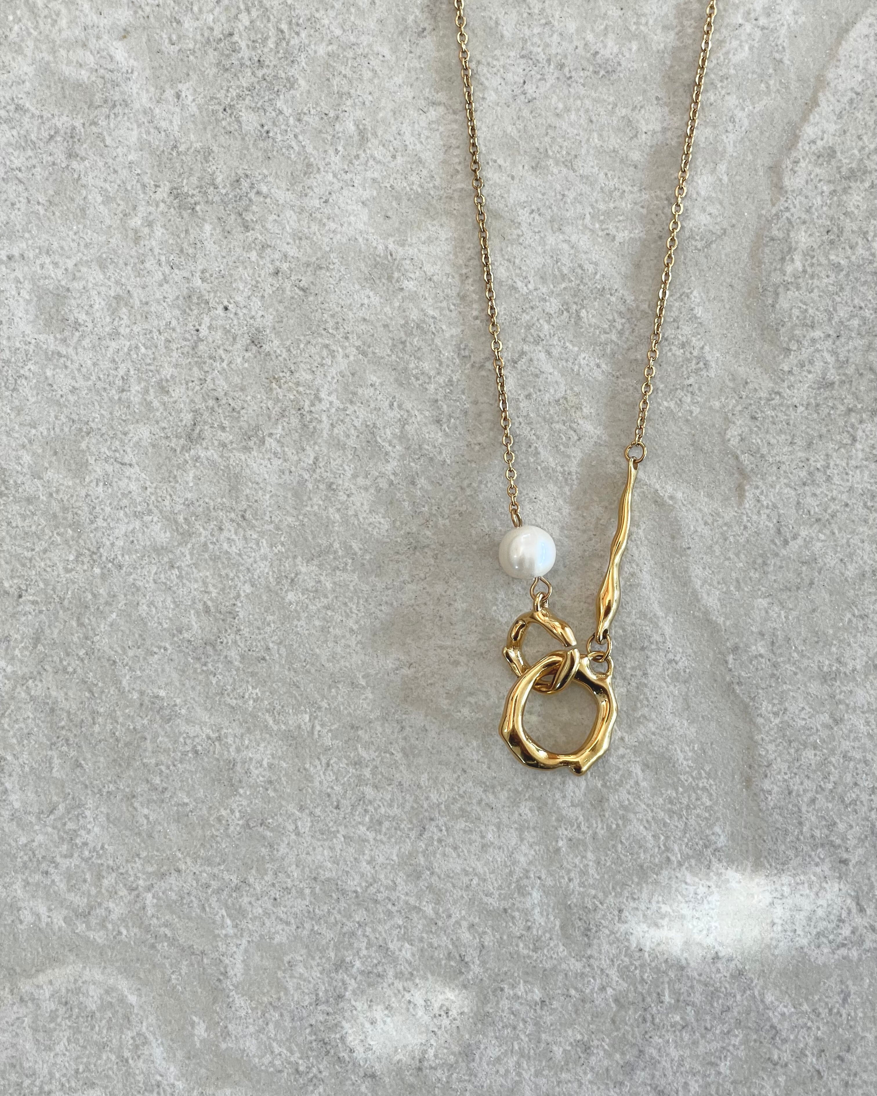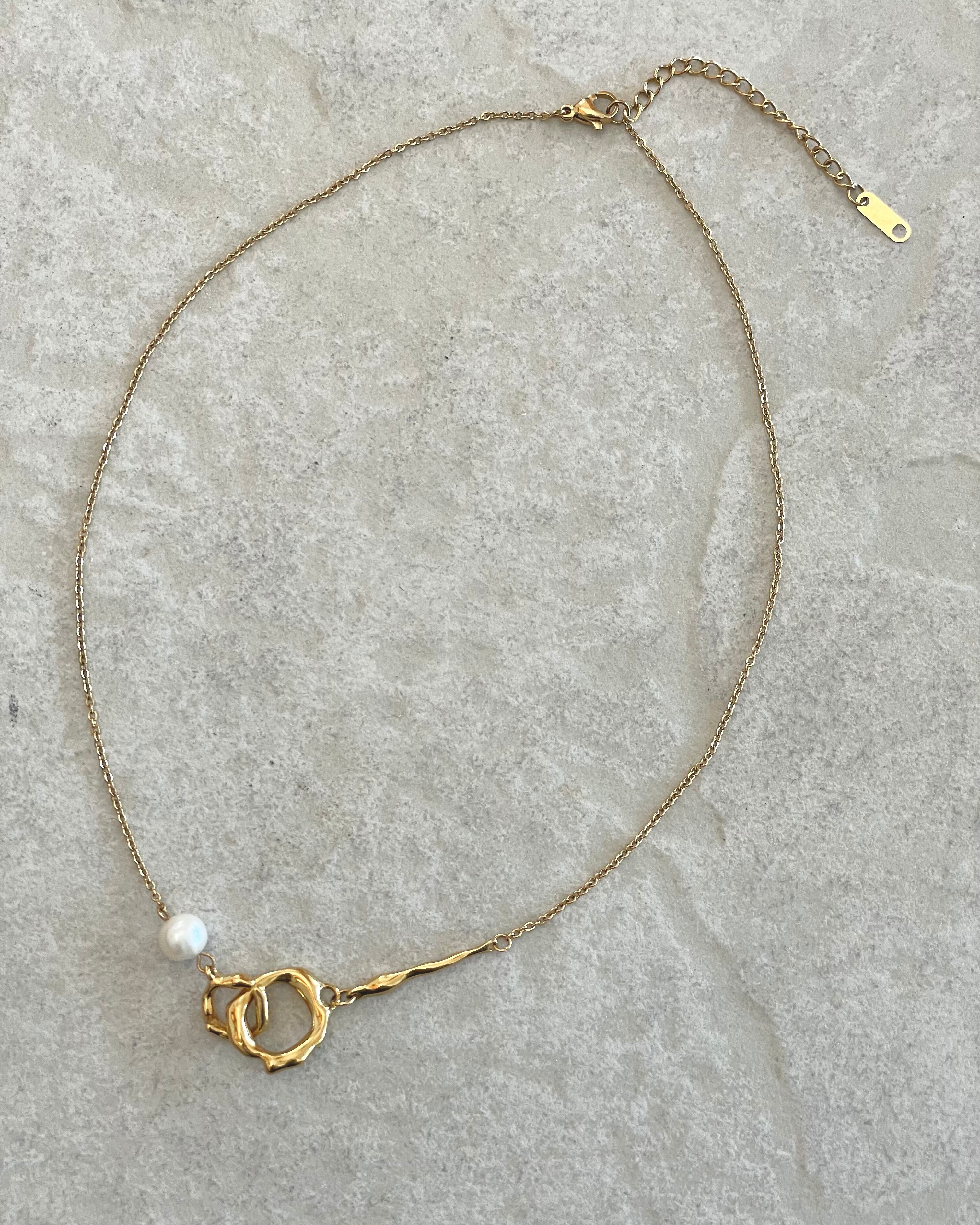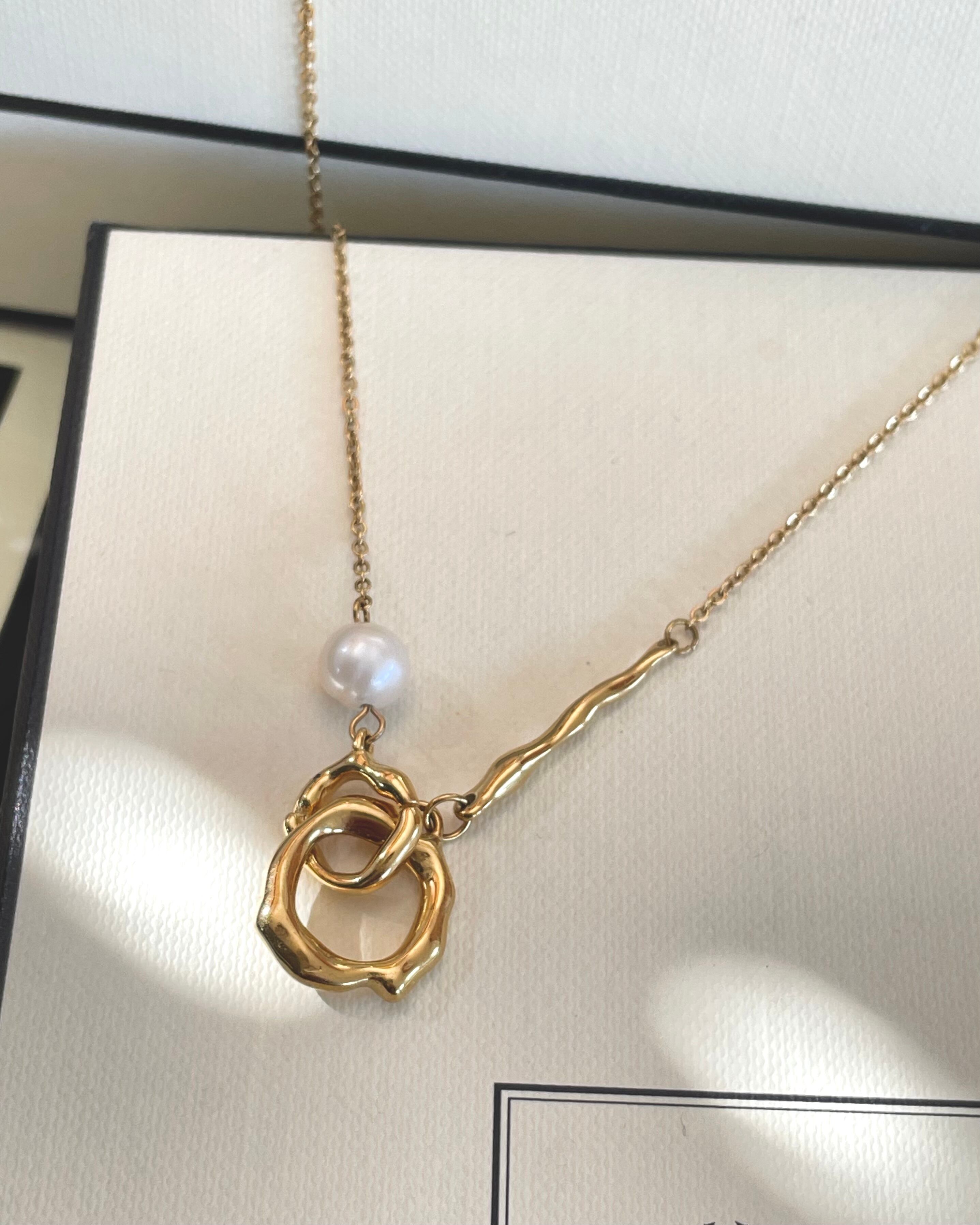 アシンメトリーなリングデザインとパールのアクセントが可愛いサージカルステンレス製のネックレスです。