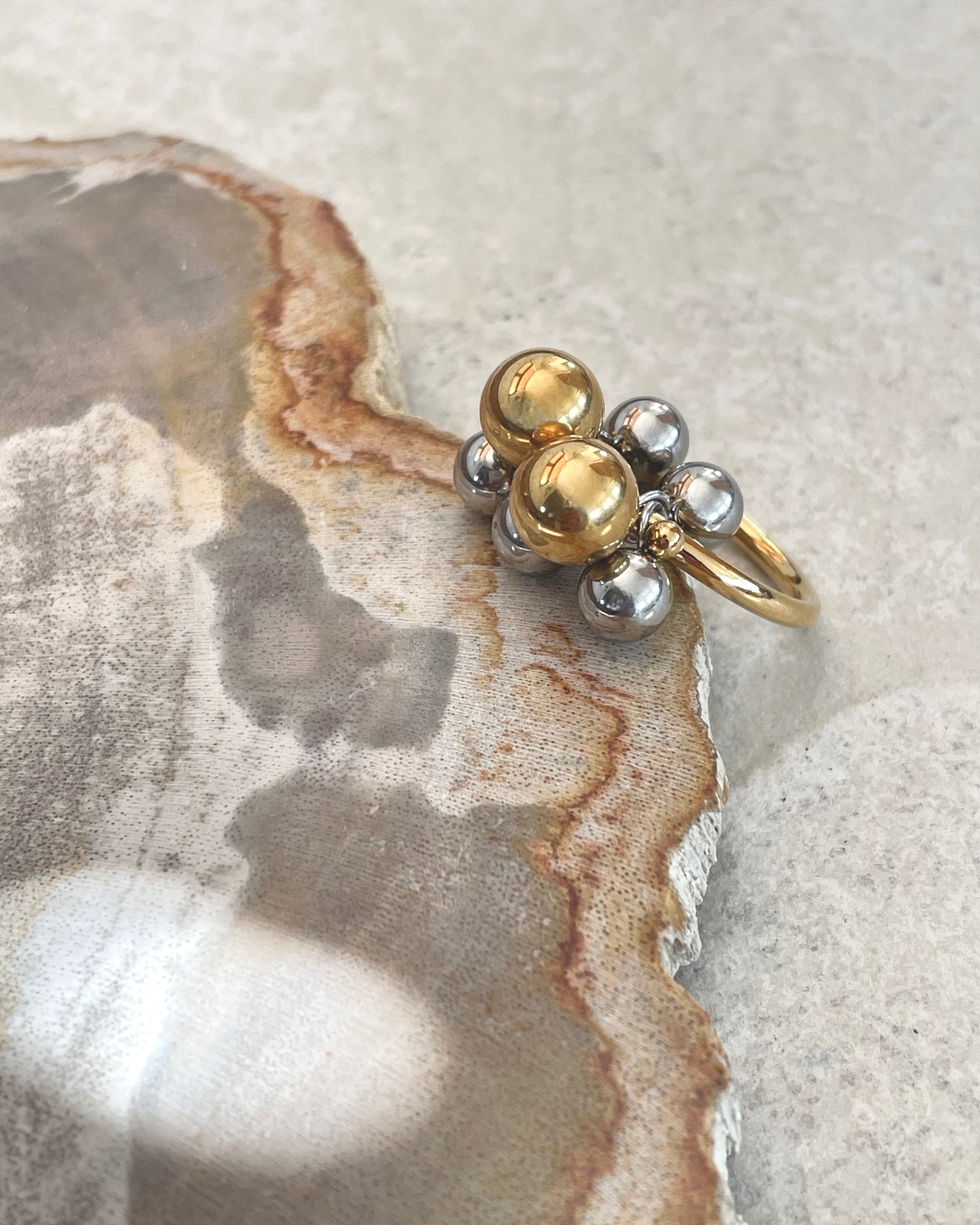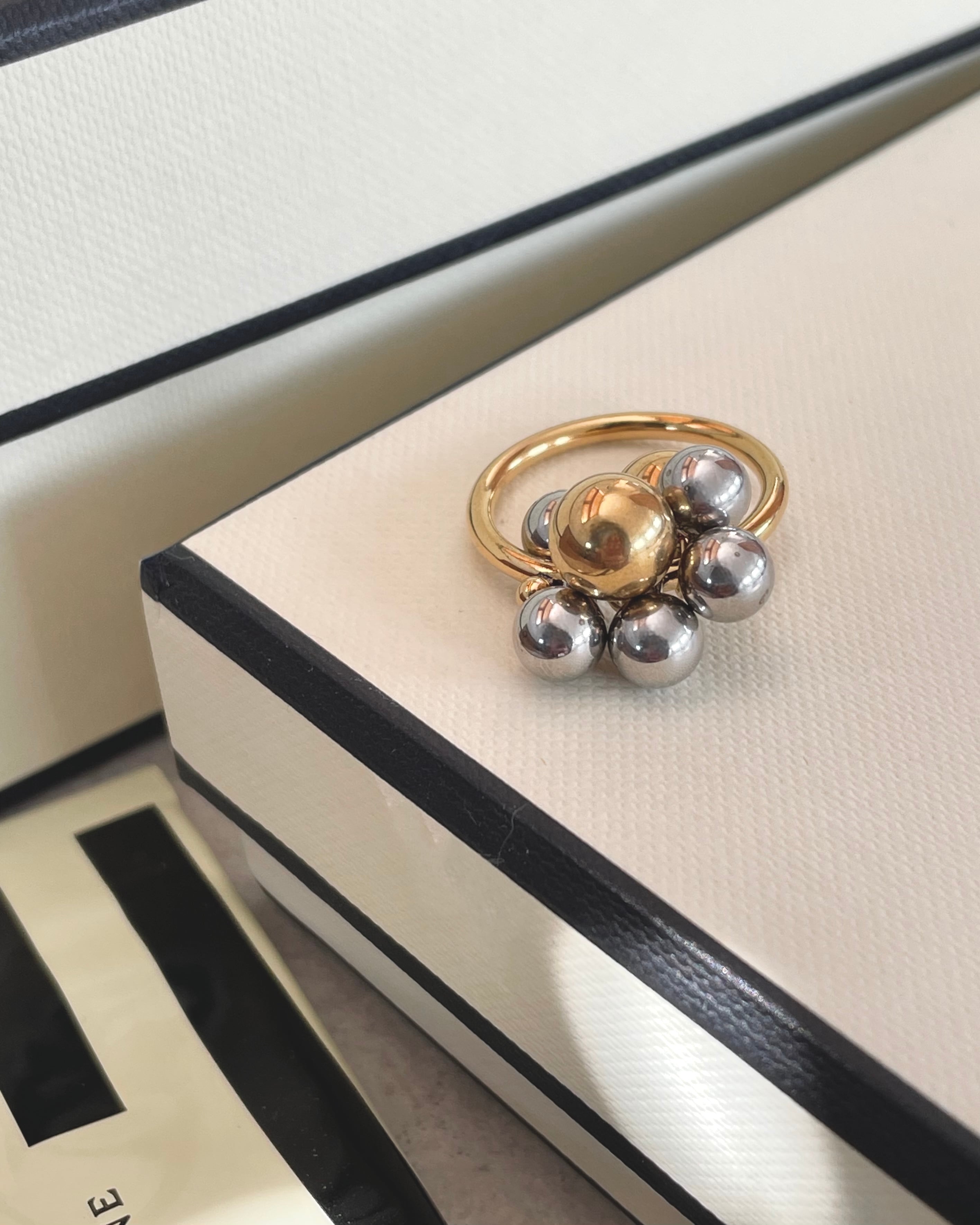 サイズと色の違うボールが可愛いサージカルステンレス製のリングです。