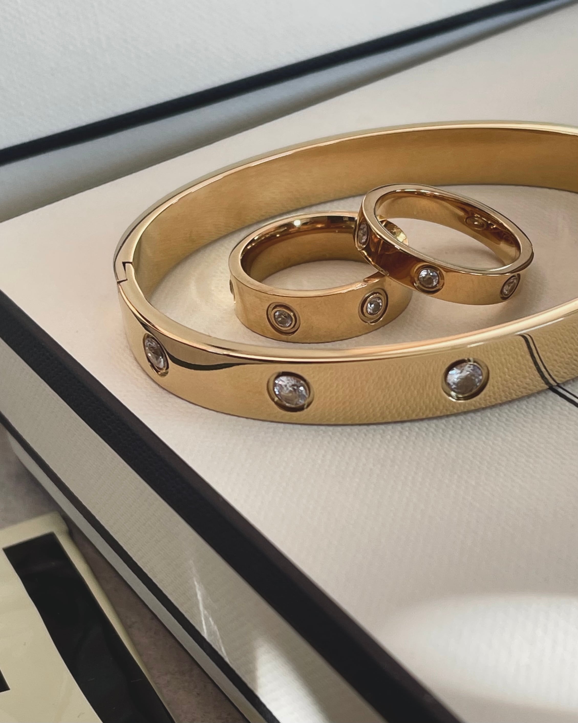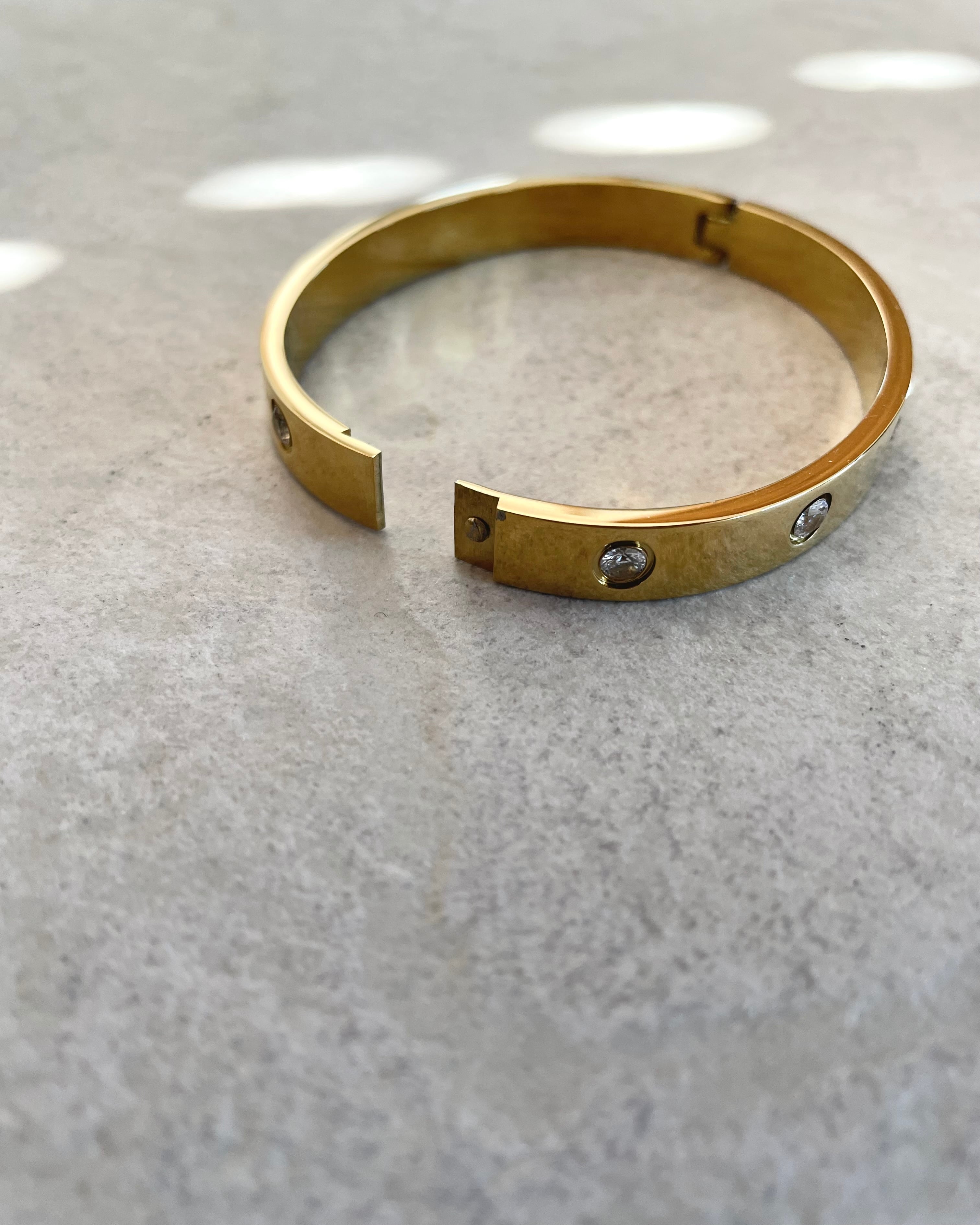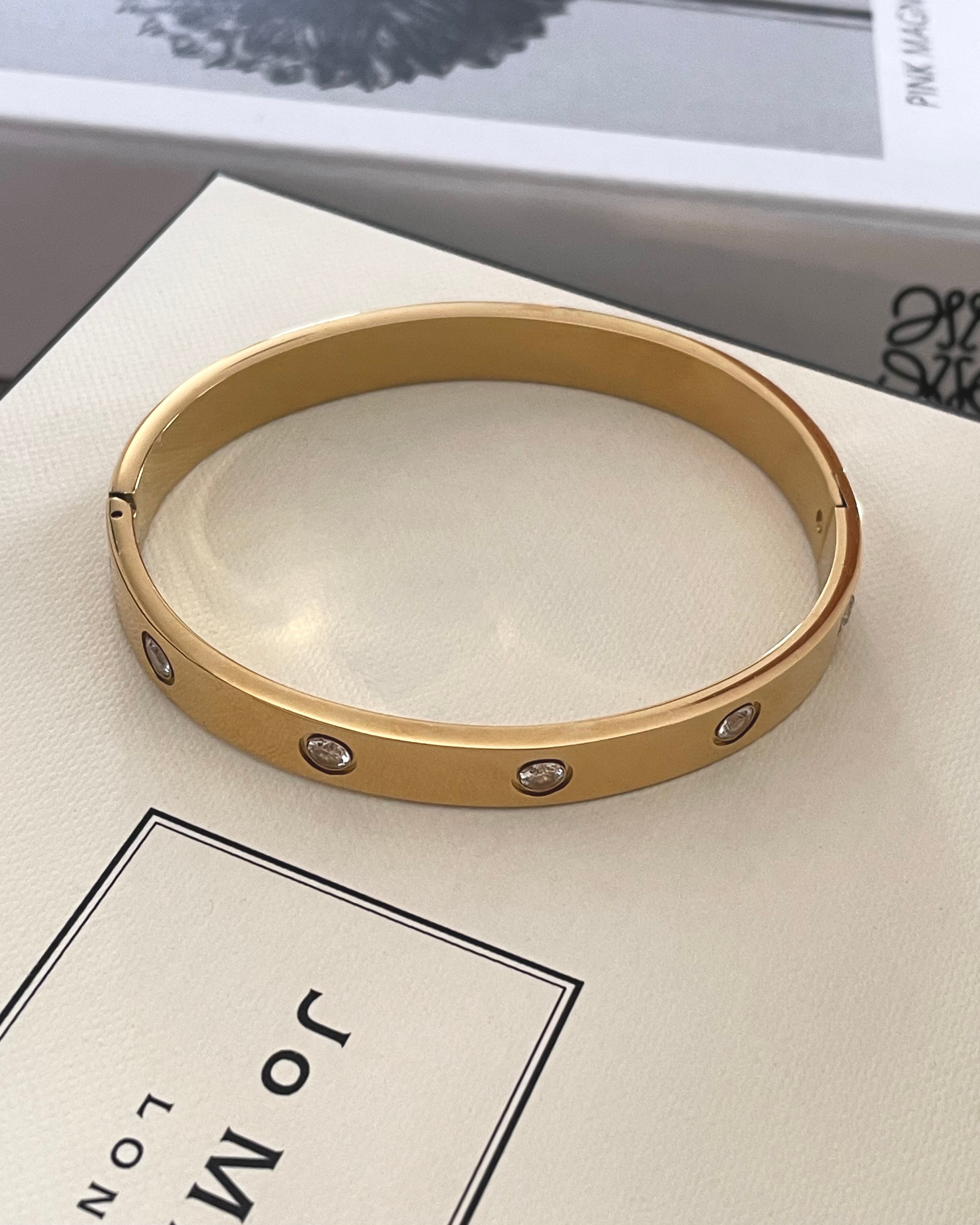 全周に等間隔でキュービックジルコニアがセッティングされたヒンジ式のオープンブレスレットです。