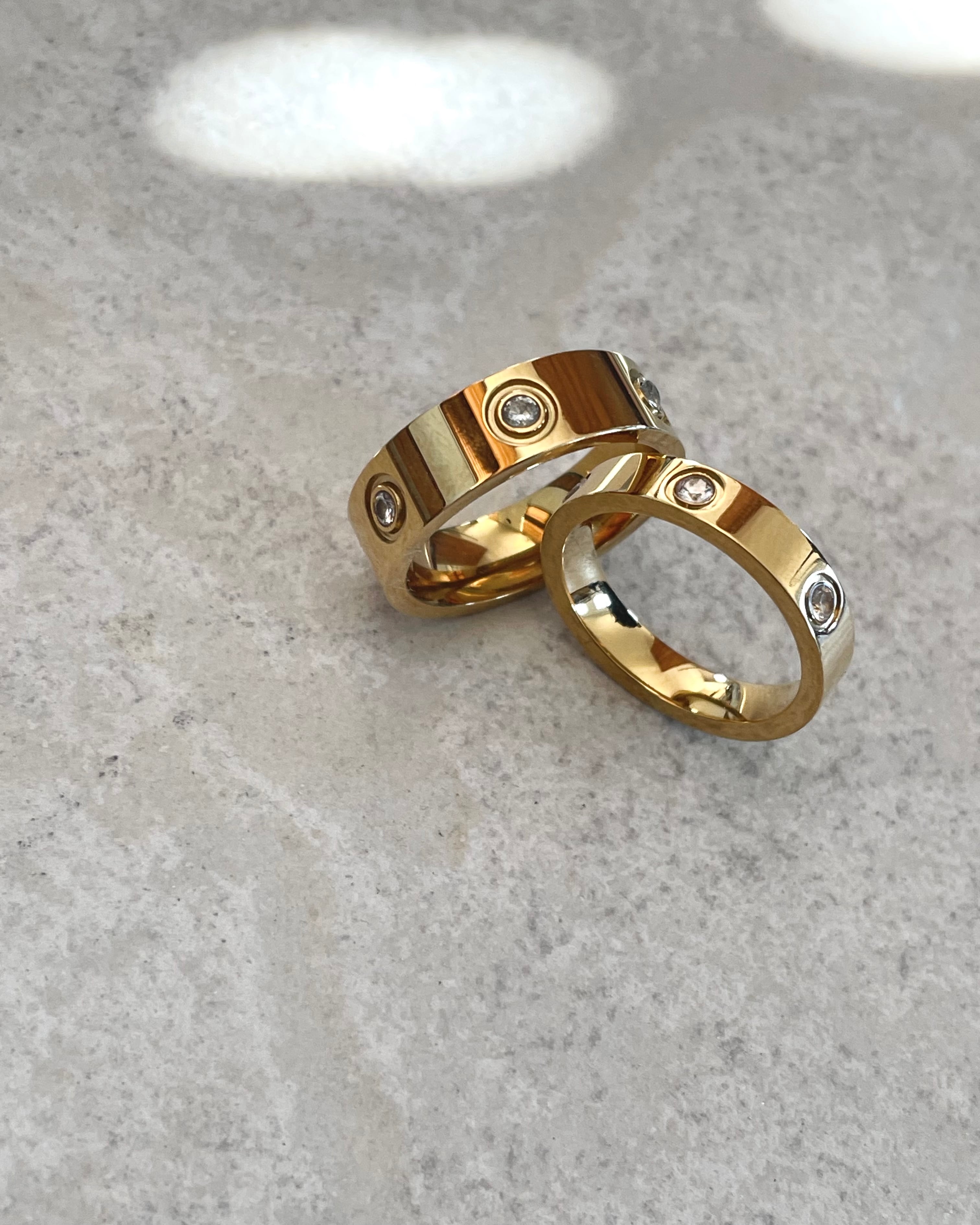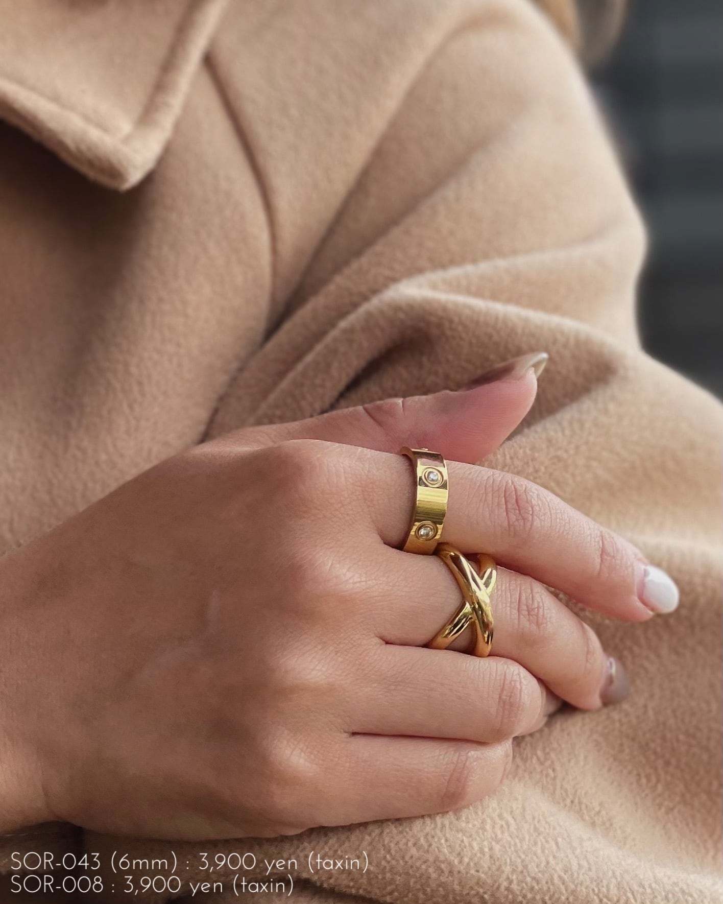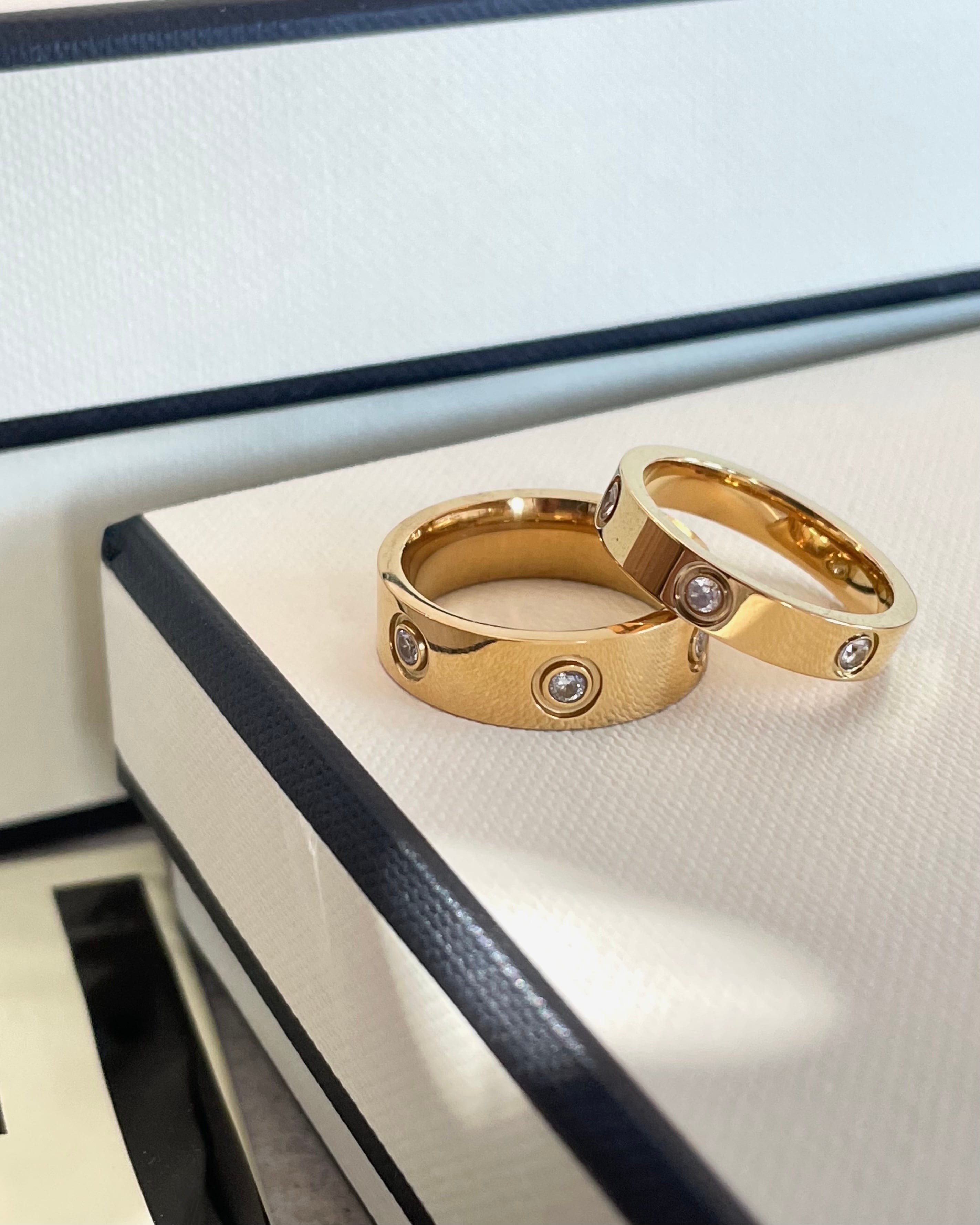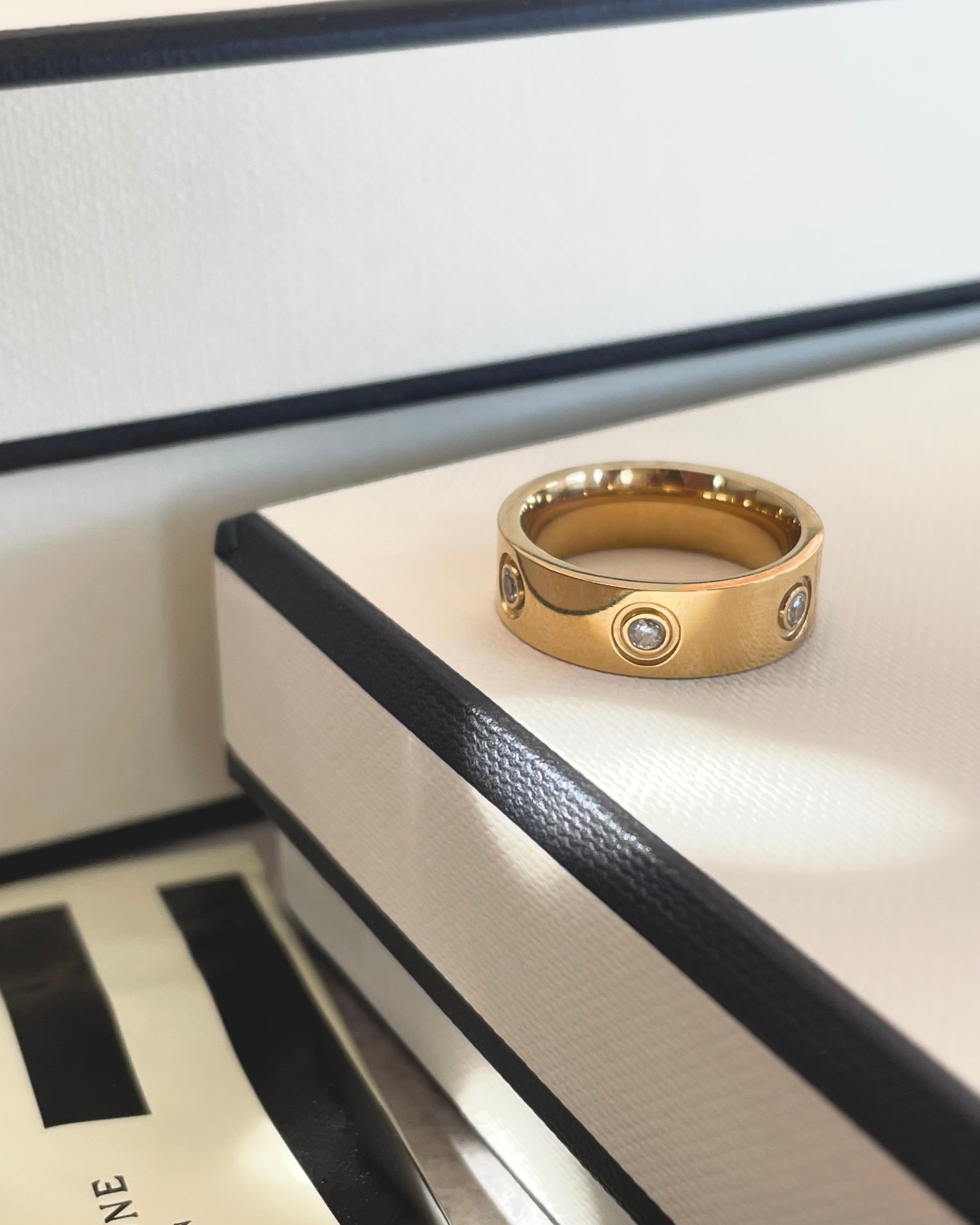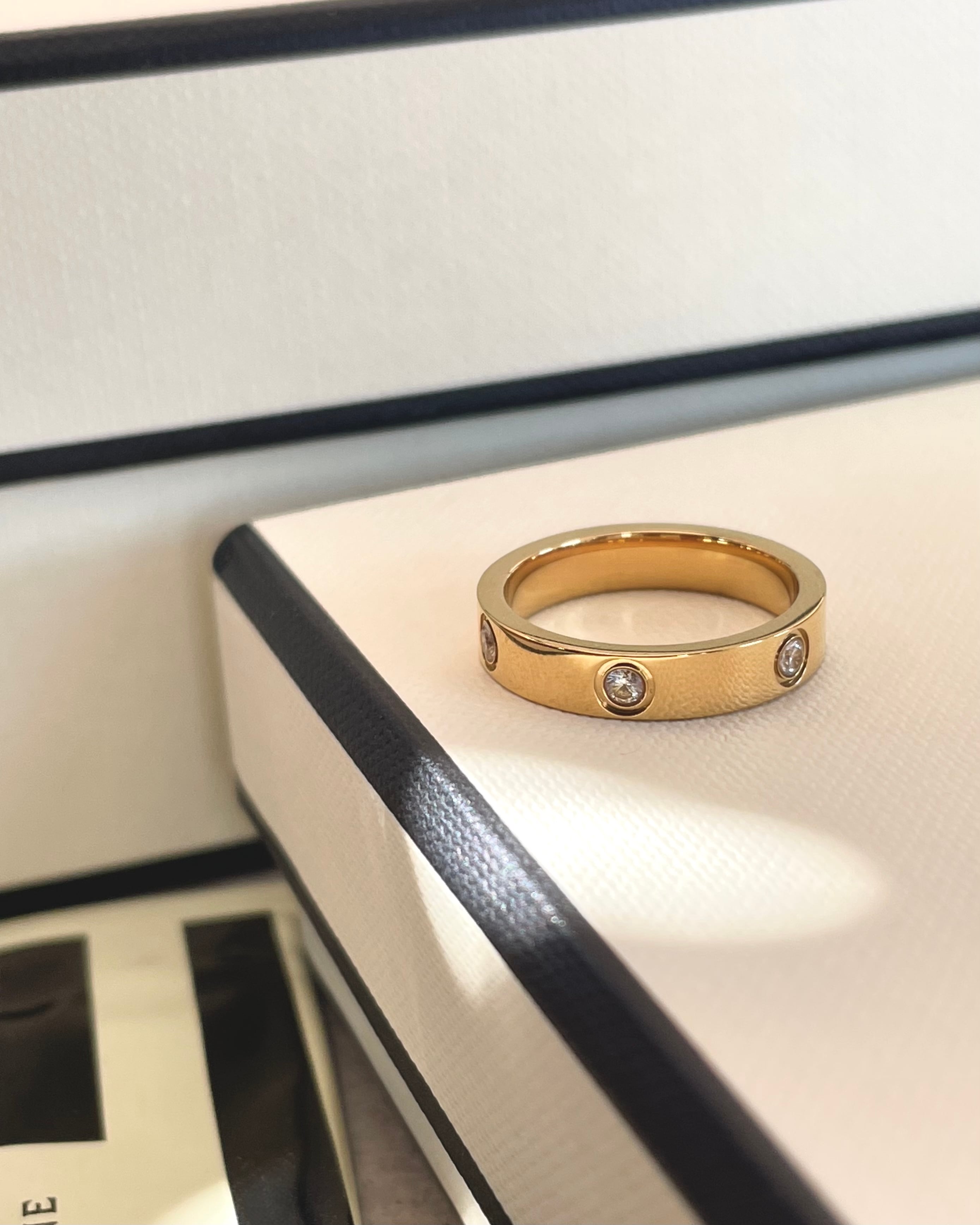 全周に等間隔でキュービックジルコニアがセッティングされた平打ちのリングです。
