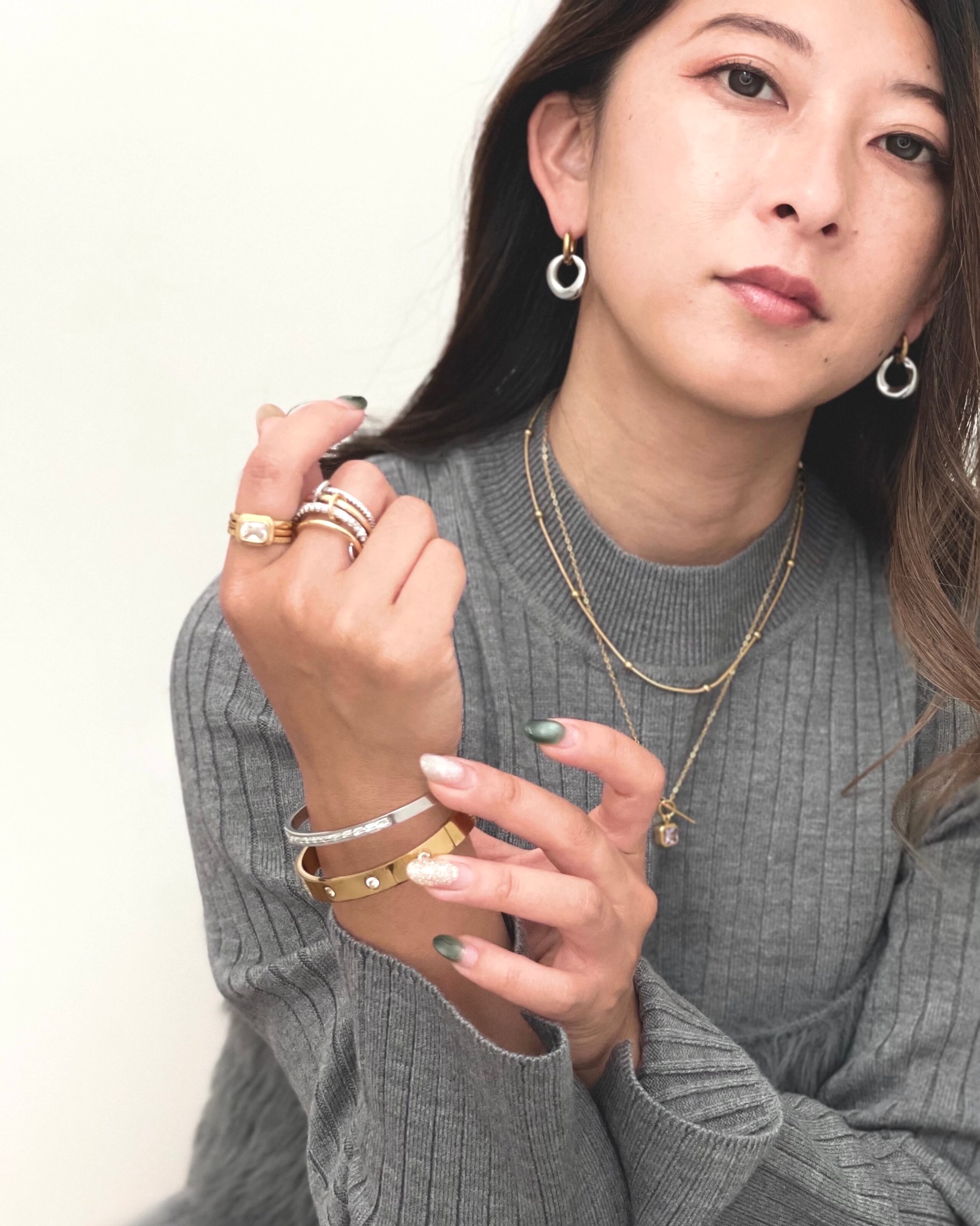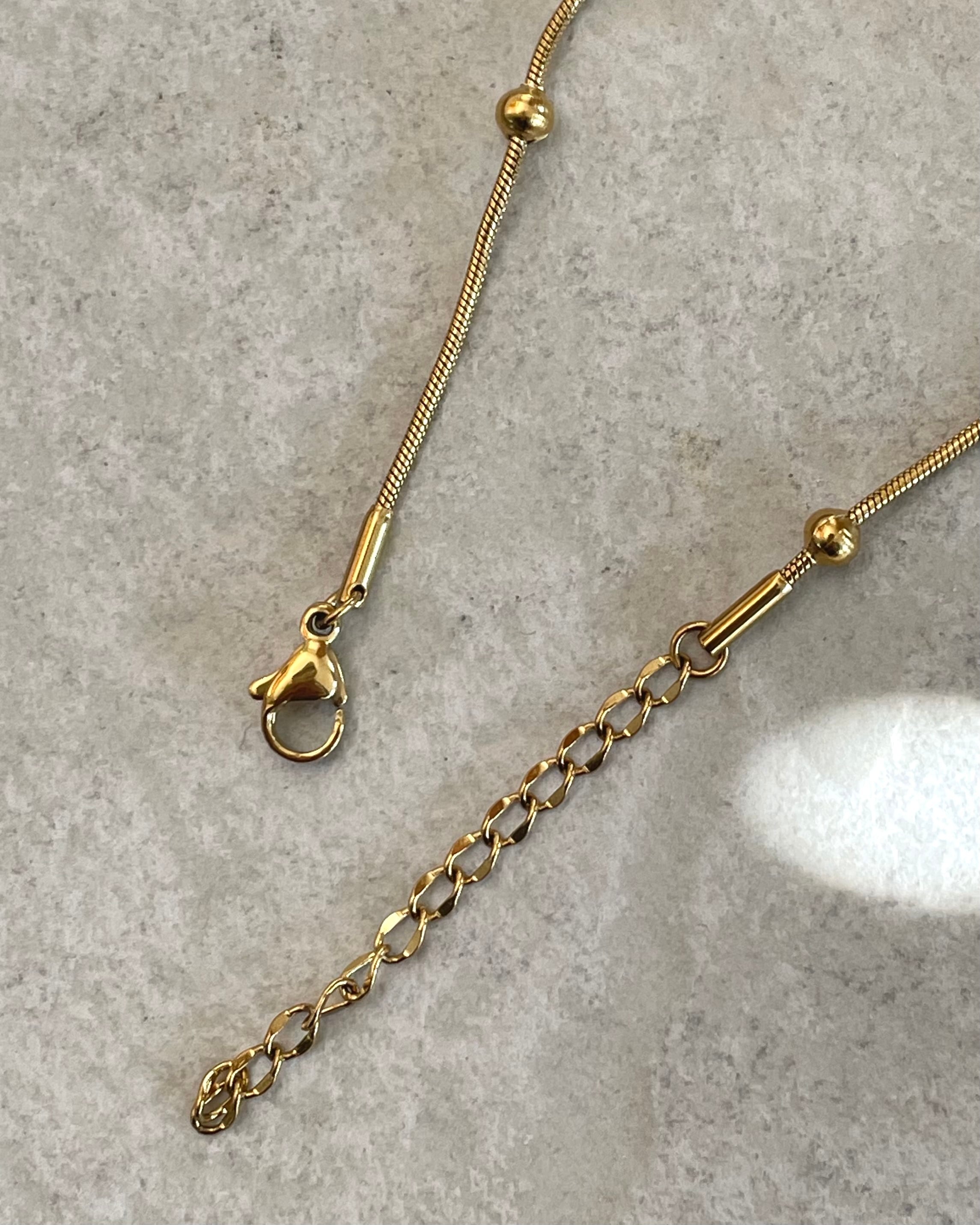 シンプルなスネークチェーンにアクセントが入る事でコーディネートの幅も広がります。