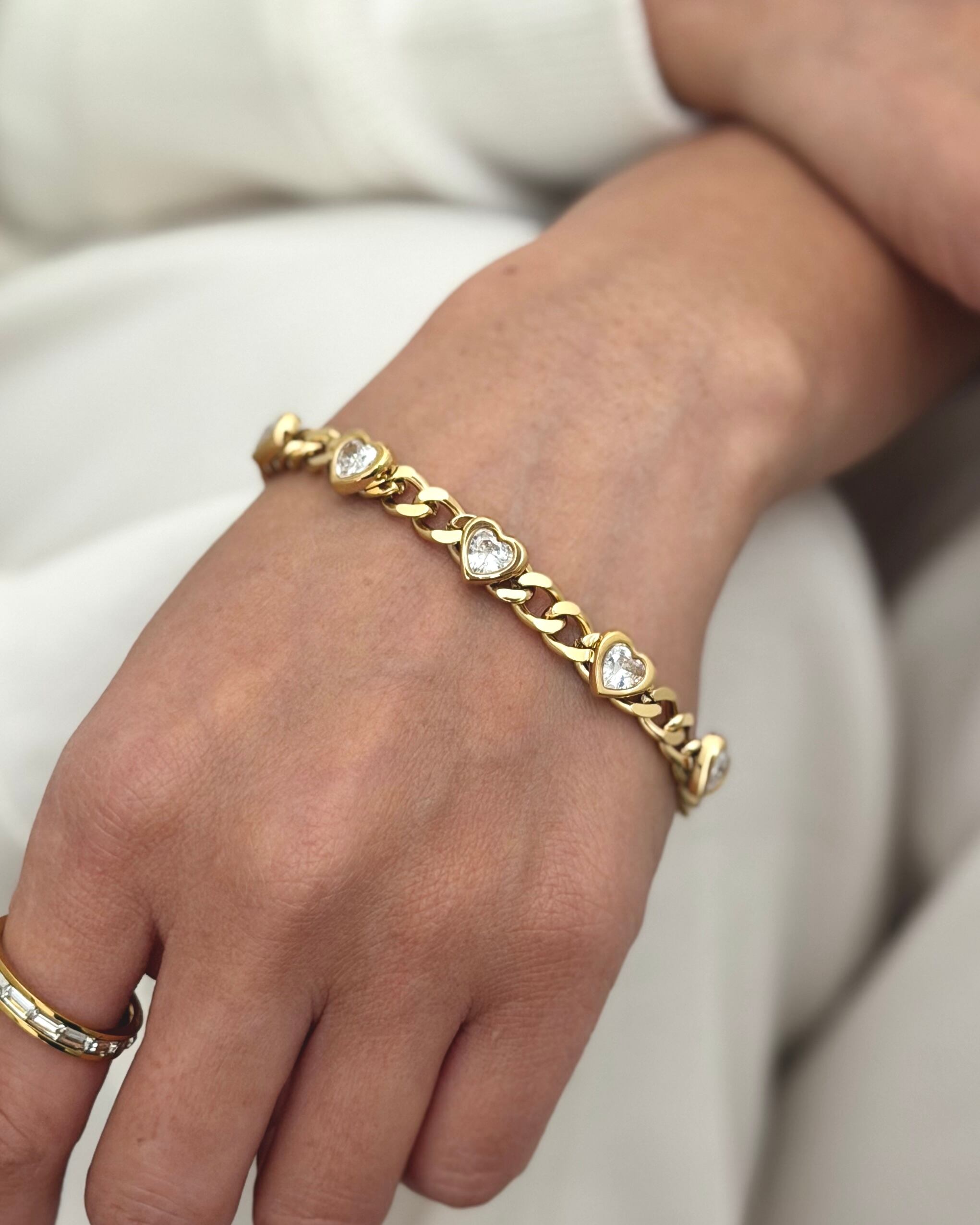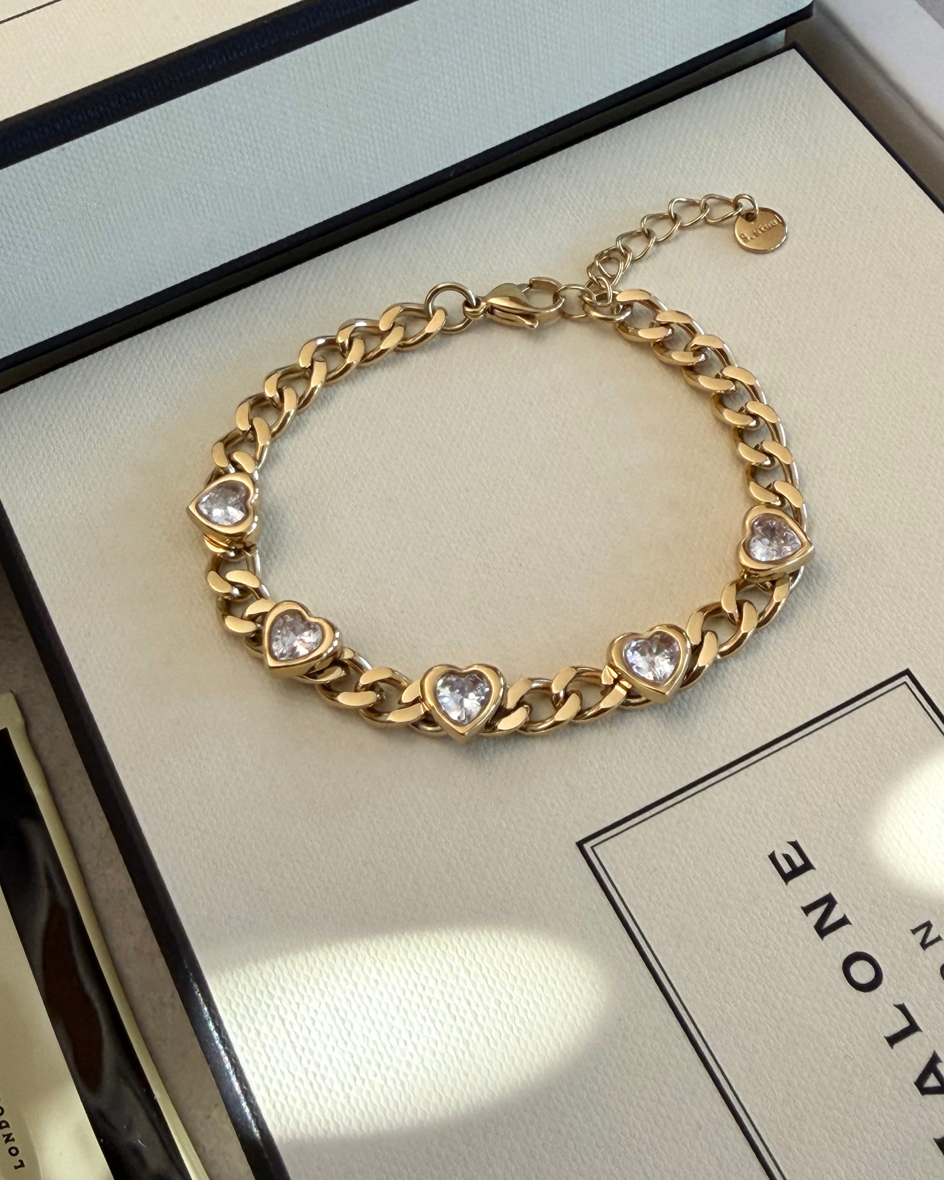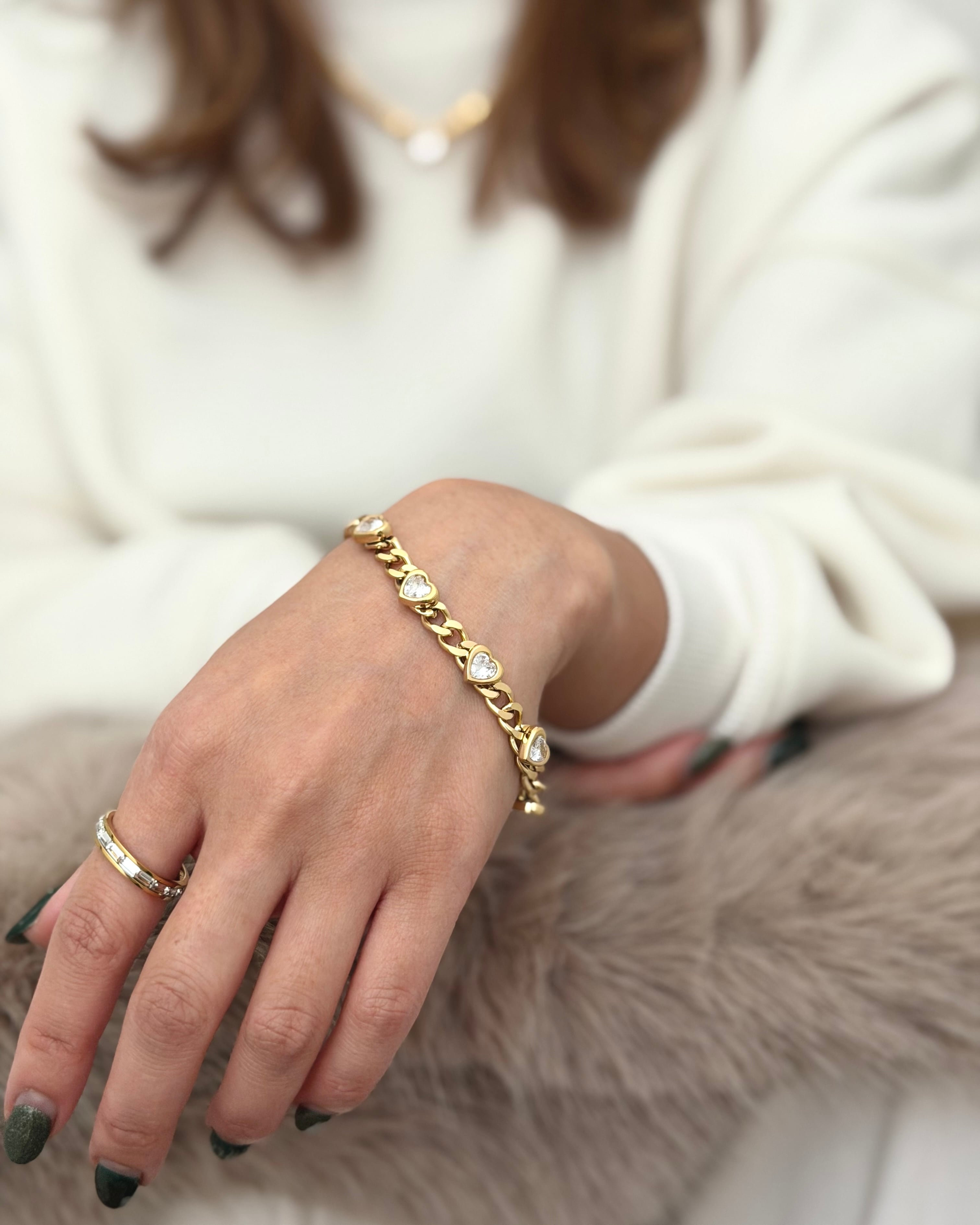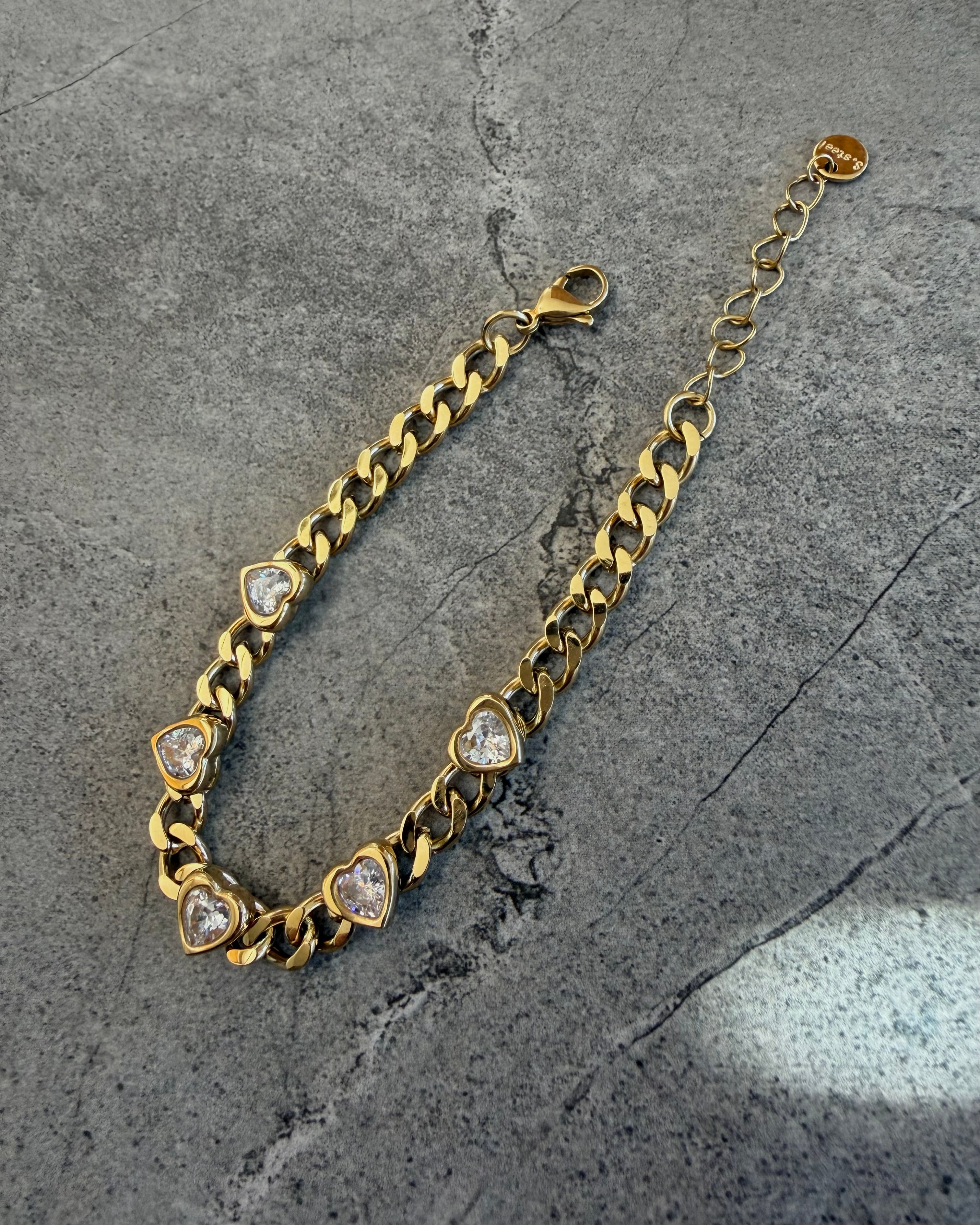サージカルステンレス製の太めなキヘイチェーンに等間隔でハートカットのキュービックジルコニアが配置されたチェーンブレスレットです。