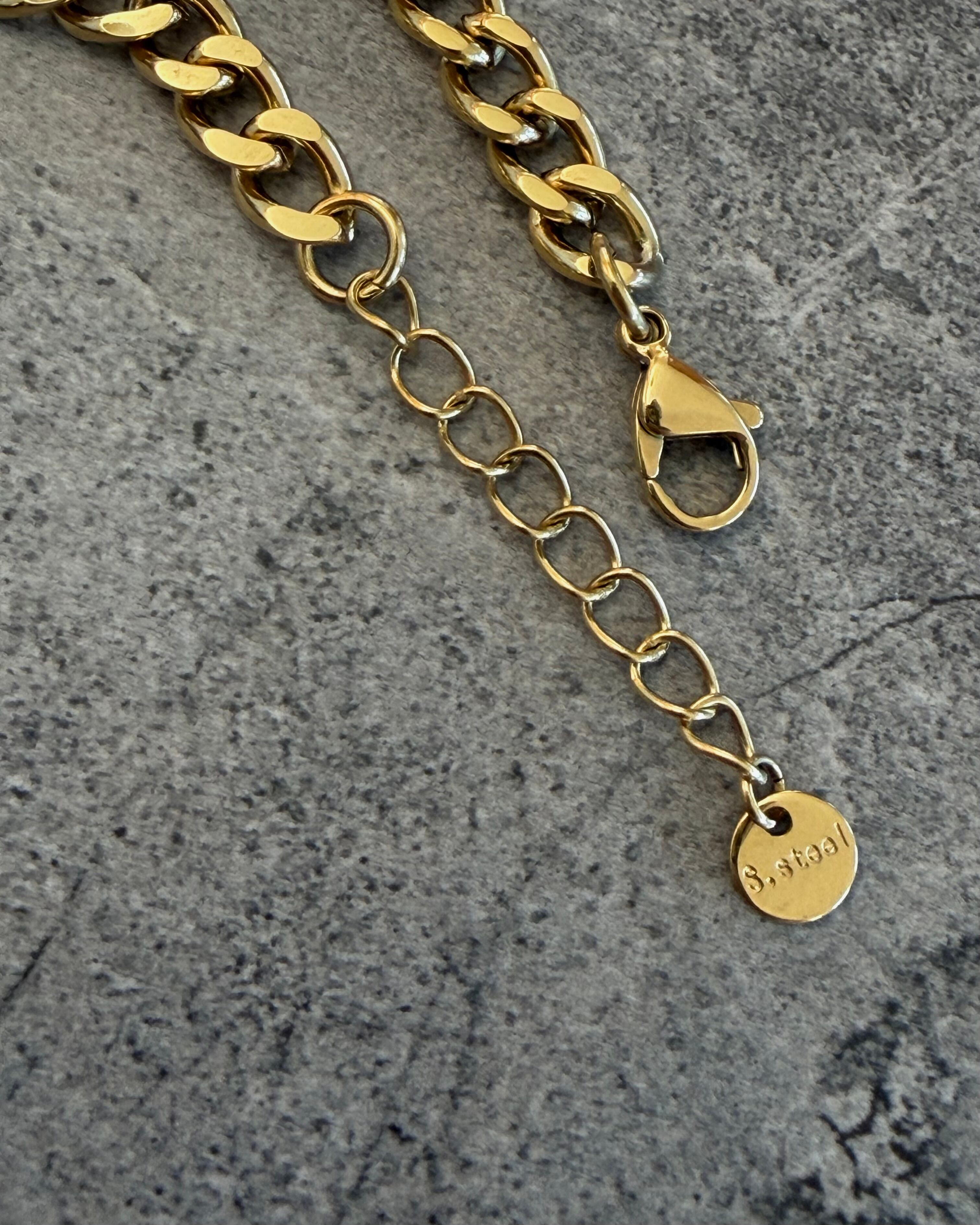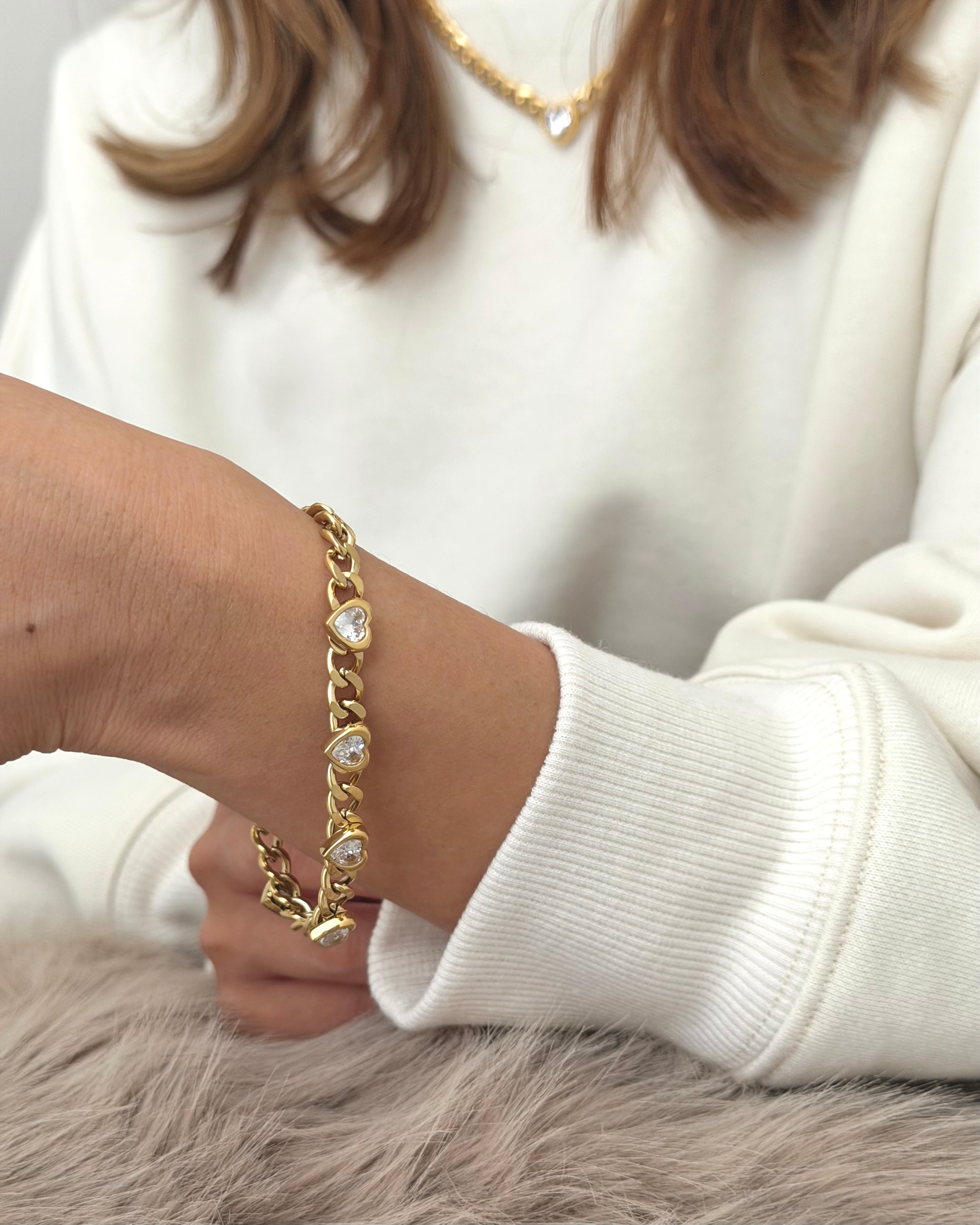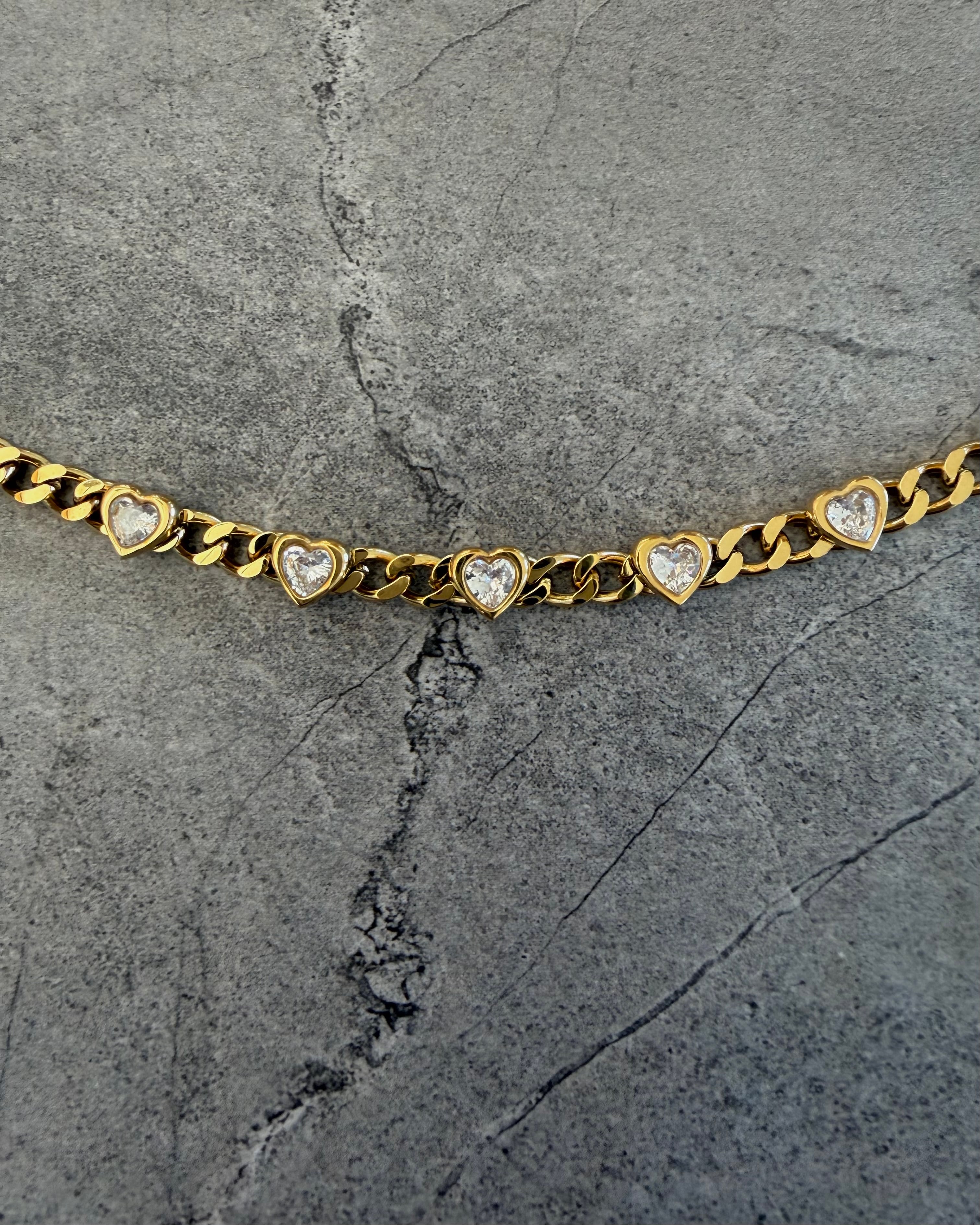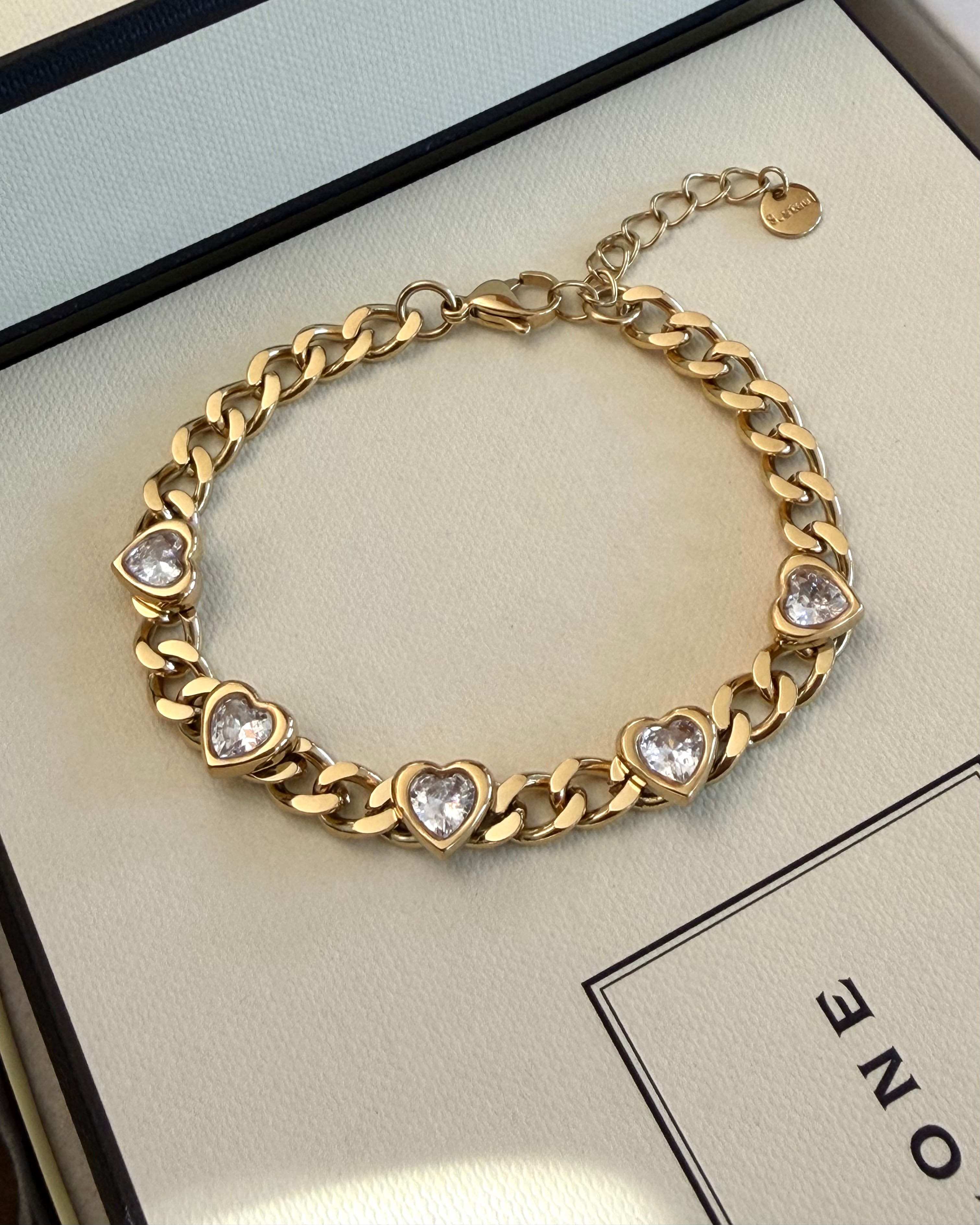 サージカルステンレス製の太めなキヘイチェーンに等間隔でハートカットのキュービックジルコニアが配置されたチェーンブレスレットです。