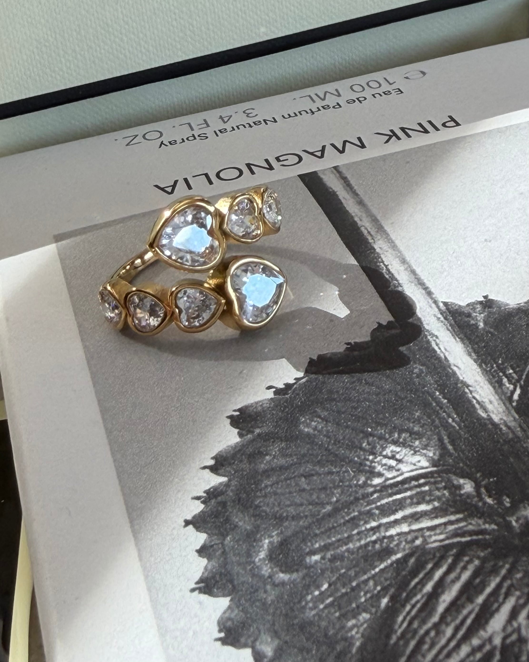 サイズの異なる計8石のハートカットのキュービックジルコニアがセッティングされたフリーサイズリングです。